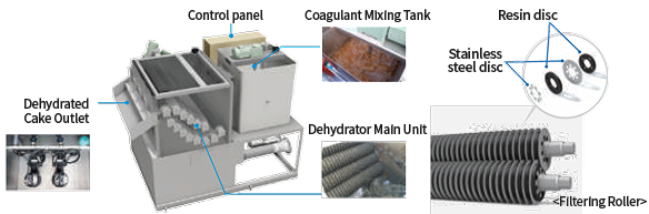 The coagulated sludge is compressed and dehydrated by each of filtering rollers |